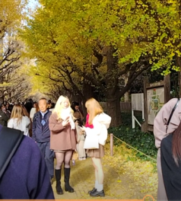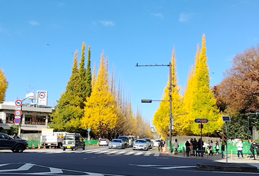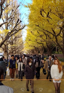 | 12月 2日(火) 神宮外苑 イチョウ並木 東京都内の紅葉のスポット言えば必ずその一つに数えられる「神宮外苑の青山通りから絵画館までのイチョウ並木」。 十数年毎年訪れていましたが、ことしは膝関節部の故障から諦めていました。でも、ようやく7割がた回復してきましたので、お医者さんの「ここが大切な時期、出来るだけ歩いて機能回復してください」とのアドバイスに従って行って来ました。 紅葉も終盤に近く、青山通り側以外はかなり散ってしまって黄色い絨毯が広がっていました。なにより外国人の多さは半端ない。それも欧米と言うより東南アジア系の方が多く、ミニスカ、ホットパンツ姿の若い女性の多い事・・・日本語を話す人の姿に会うとホッとするような感じです。これも時代の変化でしょう。良い事です。 |