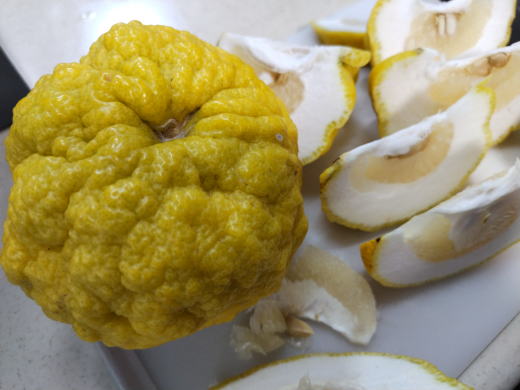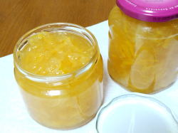 | 12月12日(金) 鬼ゆずの後始末 先日頂いた鬼ゆずは10個。第一陣は九州とか愛媛の郷土菓子として昔から作られている「文旦漬け」を鬼ゆずで作ってみようと10日ほど前に加熱し乾燥工程に入っておりました。今日はその完成行程と、残していた鬼ゆずをすべてジャムにしました。ようやくすべての後始末を終えてホッとしております。 野菜は採れたものを新鮮なうちにそのまま食べて季節感やら香り、風味、味を楽しむのが一番ですが、もう一つの楽しみ方として煮たり焼いたりの他に二次加工をして常備菜、嗜好品に変身させることがあります。干し柿やジャムづくり、嵌まると面白いですよ。暇人ならではの楽しみ方、来年はもっと幅を広げて試行したいものです。 |