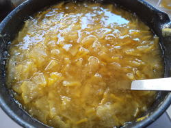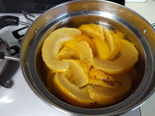 | 12月 3日(水) 冬の味覚、自家製「鬼ゆずピール」 冬は自家製食品を作るのにふさわしい季節です。各種の漬物や食用菊の酢の物、干し柿作り、そして「鬼ゆずピール」。どれも季節感満載です。 昨日から「鬼ゆずピール」のためにガス台を占拠して付きっ切りでで煮ています。 30分おきに弱火で煮ること3回。砂糖の量、寝かせる時間とタイミング結構微妙な調整が必要です。今日は煮る段階まで完了、明日はいよいよ乾燥に入ります。 2週間後の味見を思い浮かべて今からワクワクしています。 |