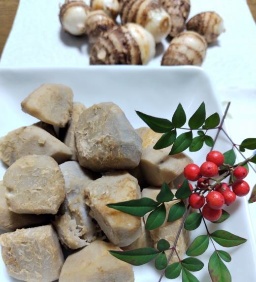 | 12月 5日(金) 真冬の畑 しばらくご無沙汰しておりました畑。行って見ると分かりました。少し残っていた夏野菜は葉っぱが萎れ黄色く枯れている一方、ダイコンやブロッコリー、白菜、キャベツなどは緑いっぱいイキイキ葉っぱを広げていました。里芋や生姜は地中でしっかり時を持っています。ことしは数少ない里芋が貴重品。最もオーソドックスに里芋の煮っころがしにしてみました。あったかいおふくろの味です。静かに時が流れた遠い昔を思い出します。 |