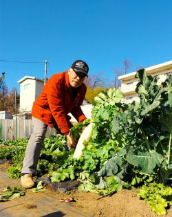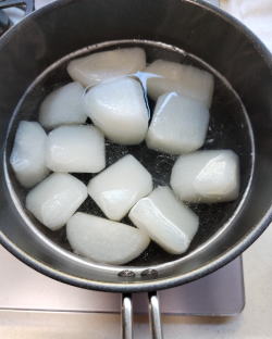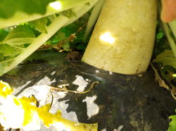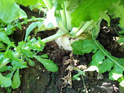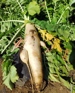 | 12月18日(木) 冬ダイコン引き抜きの儀 冬料理の定番の一つと言えば、「おでん」。中でもダイコンは人気の品。熱々ふわふわのダイコンはいかにも体の芯から温まります。今年は種から育ており、今はもう畑の上に白い部分を15cmも出すくらいに育っています。本体の重さと葉っぱの重さを測れば多分10kgは在ろうかと思われる巨大三浦ダイコン。とにかく巨大すぎて入る鍋もなく、ダイコンの煮つけ、下ろし大根、漬物にと使った残りの半分は娘の所に引き取ってもらいました。 今日の所は調理が一番簡単な「とろとろ大根の味噌田楽」を作ってみました。熱々のトロトロ、美味しくて箸が止まりません。一挙にはけそうです。笑 |