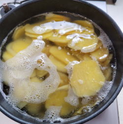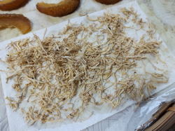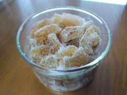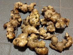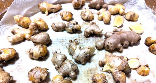 | 12月21日(日) 残り生姜を二次加工へ 生姜を畑から掘り出して来たのが今月の14日。乾燥生姜を作ったきりで大半を残して冷暗所に自然放置していましたら、何とカビが猛繁殖して雲がくっついたようになっていました。里芋やジャガイモなどの根菜は大丈夫なのに生姜だけがダメと言うのは知りませんでした。新ショウガは水分が多く、皮が薄い、繊維が柔らかい特徴がありもともと傷みやすく、さらにビニール袋に保管していたため余計に水分が抜けにくかったことが原因らしいです。根菜の中でも新ショウガは足が速く腐りやすいらしいです。何とか危ないところで気が付いてよかったです。大至急「生姜糖」と「生姜グミ」を作ろうとほぼ一日かけました。 |