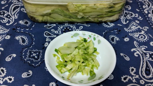 | 12月13日(土) お漬物に眼がない私たち 関西育ちの私たち夫婦は「食」に関する好みは似ており、お漬物好きもその一つ。生活が関東に移っても年を追うごとにお漬物抜きには食事が捗らない。関東にも美味しいお漬物はありますが、関西のお漬物は塩加減、漬け込み時間、うま味成分が繊細で味と風味、歯ざわりどれをとってもレベルが高い。他はともかくお漬物にかけては口が肥えている身とすれば、自家製とは言え手間をかけて作ります。 今日は、畑のキャベツを使って大阪から取り寄せているお気に入りの高級漬物の味に挑戦するつもりで取り掛かりました。 |
