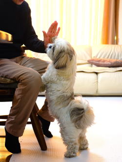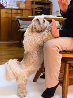 | 12月16日(火) ナナちゃんの持っている唯一の「芸」 とても従順で少し声を荒立てれば、ほとんどのことは出来るのですが、驚くような「芸」を教えていません。唯一出来るのは「ハイタッチ」位で、昔ながらの「お手」「おまわり」「ふせ」は出来ません。小学生の子供たちに会うと、どうしても「お手」を要求されてしまいます。また、ご褒美がないと出来る「ハイタッチ」も披露してくれないので、何もできない犬のように思われています。 今日は、出来ると言うハイタッチ芸を写真に撮ることにして実演してもらいました。この「芸」の面白いところは「かわいいナナちゃん!」と言うとやりますが、「おブス」とか「デコピンちゃん」などと言うとソッポを向くことですが、その表情は動画でないと難しかったです。今回は静止画ですが今度動画版を公開します。 |